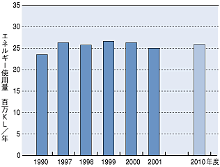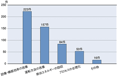 | 大多数のJRCC会員が参加している日化協の「環境保全に関する省エネルギーの自主行動計画」のフォローアップのまとめによると、2001年度に行なわれた省エネ対策の実施例は、下記のグラフのように示されます。その合計の原油換算削減量(年間ベース)は268千KLとなっています。 |